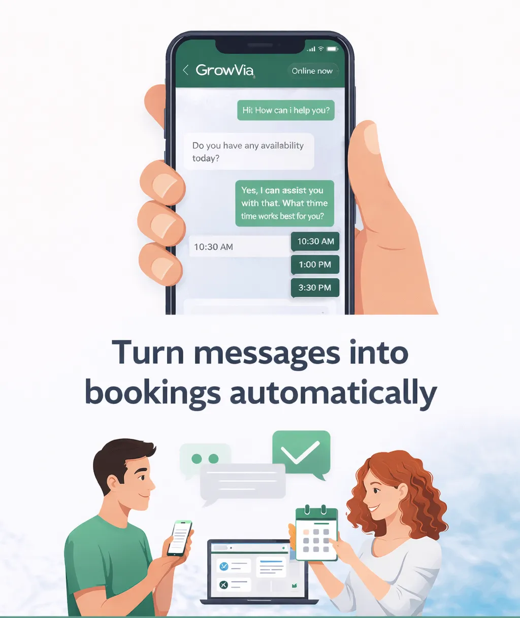 When someone reaches out through your website or DMs, the AI responds instantly, answers questions, and keeps the conversation moving — even after hours — guiding prospects toward booking or contacting your business.